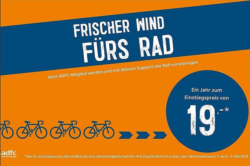 Du möchtest den ADFC bei seiner Arbeit unterstützen? Dann werde jetzt Mitglied zum Einstiegspreis von nur 19,- € (regulär 66,- €) für ein Jahr! Mit deinem Support können wir uns in der Politik für bessere Radwege stark machen.