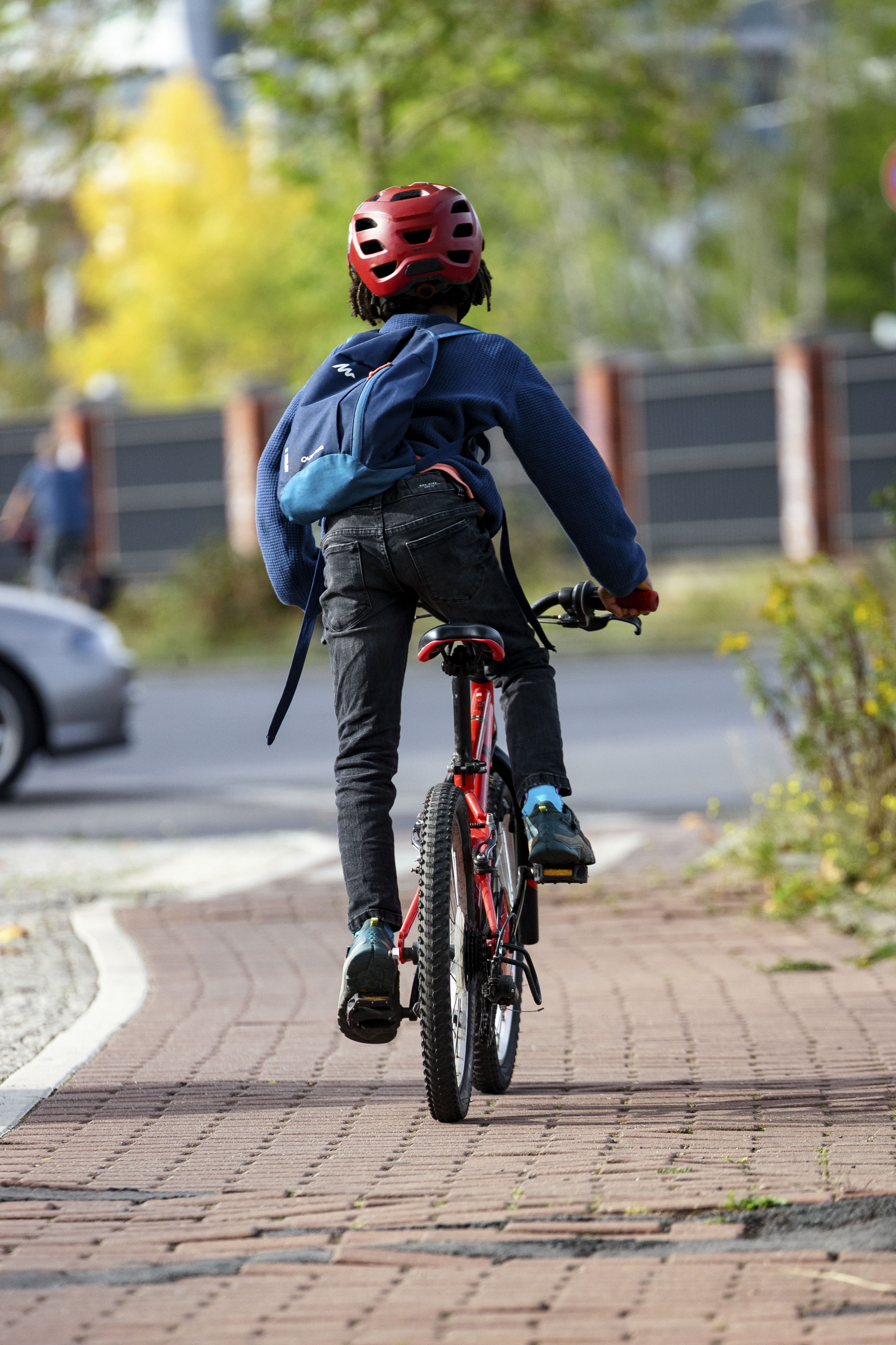 Junge von hinten auf dem Radweg